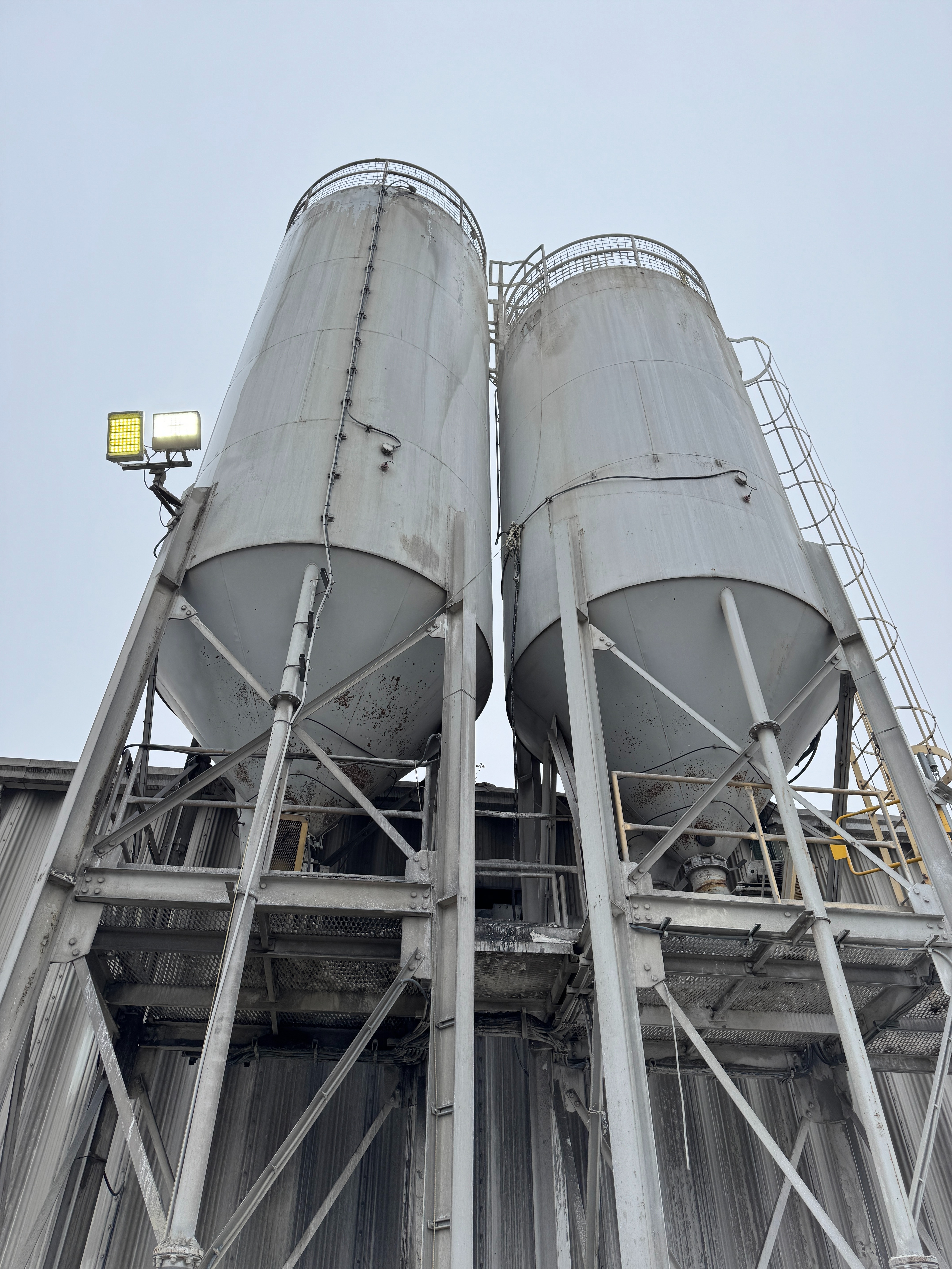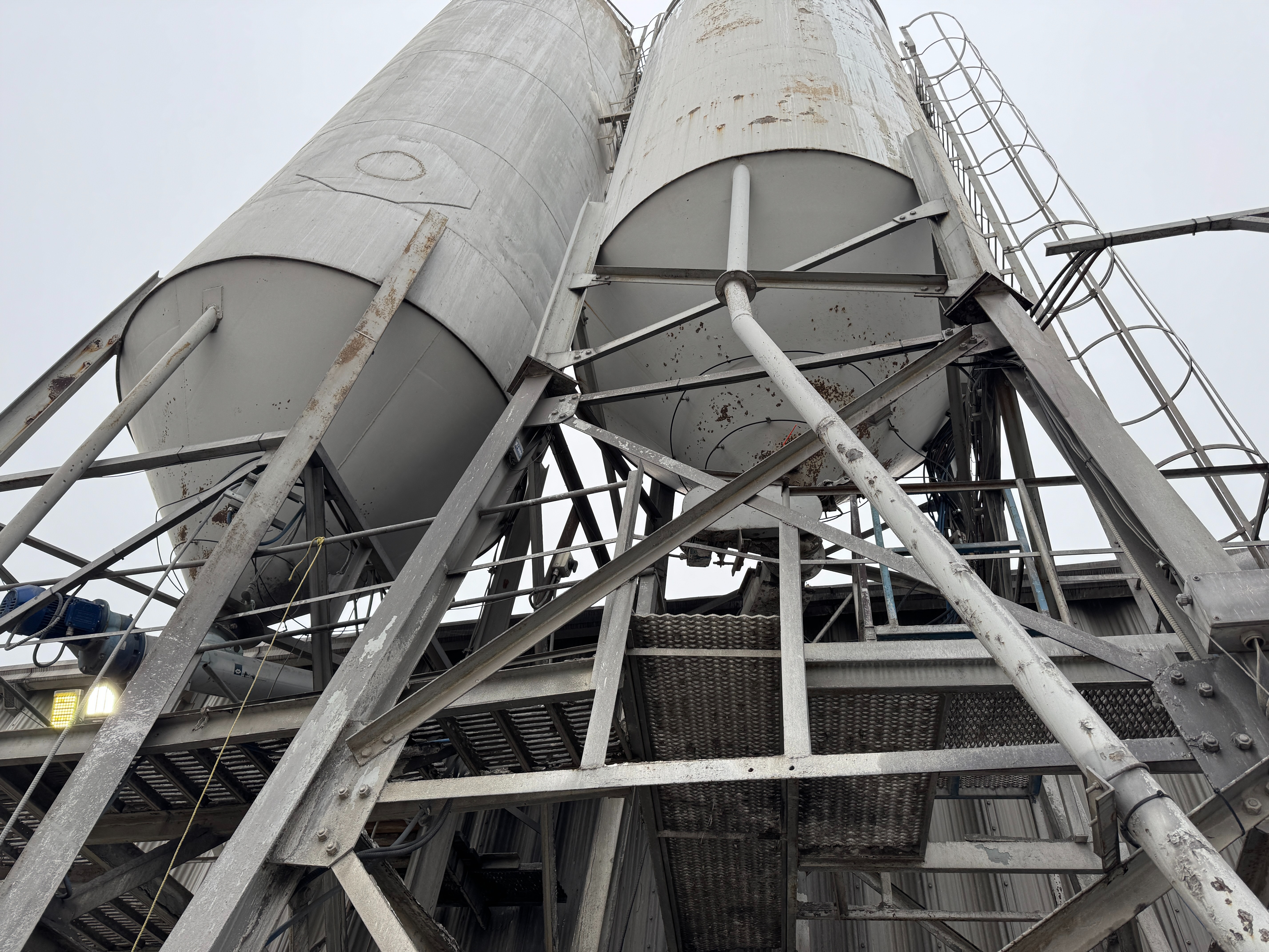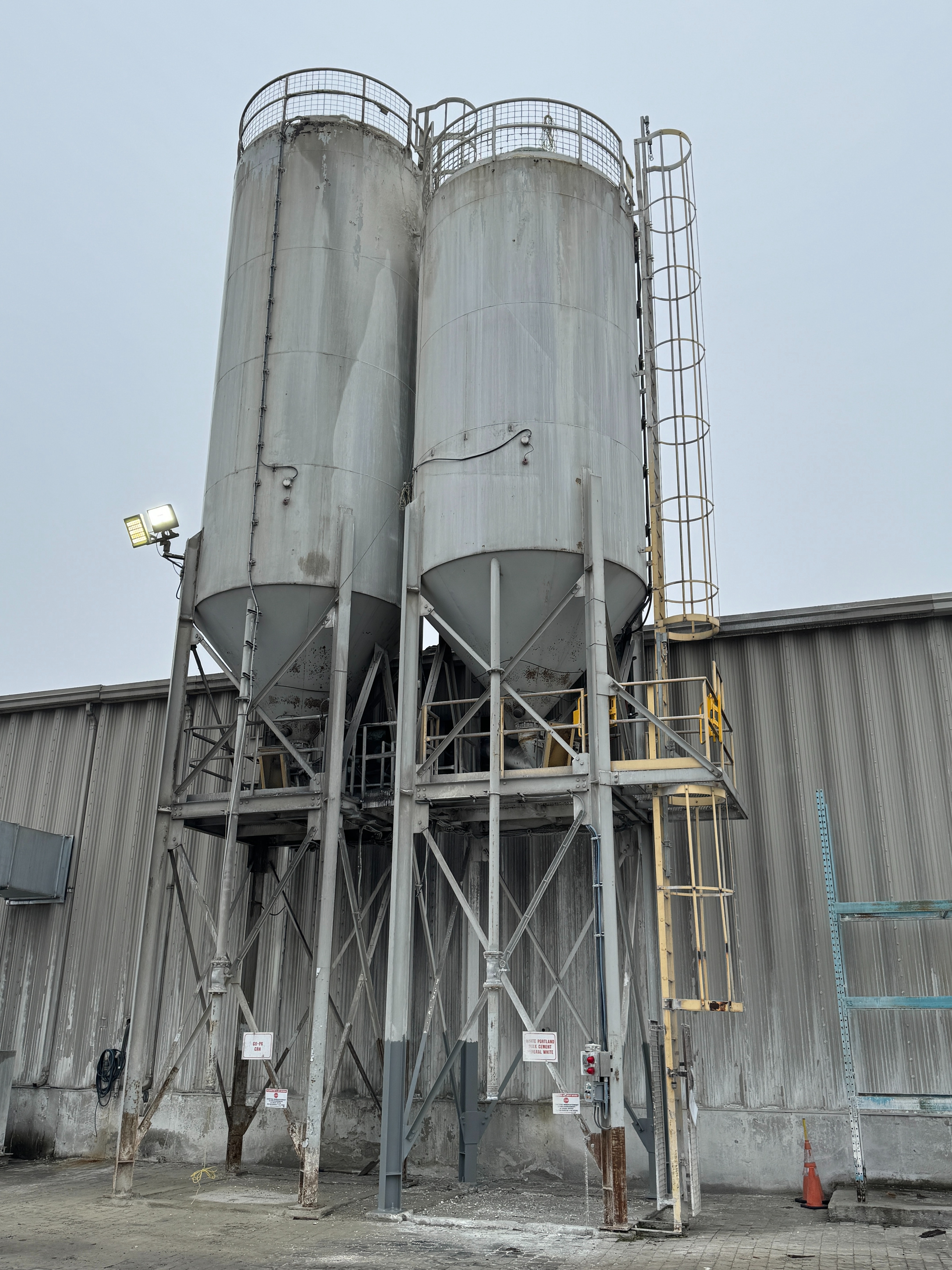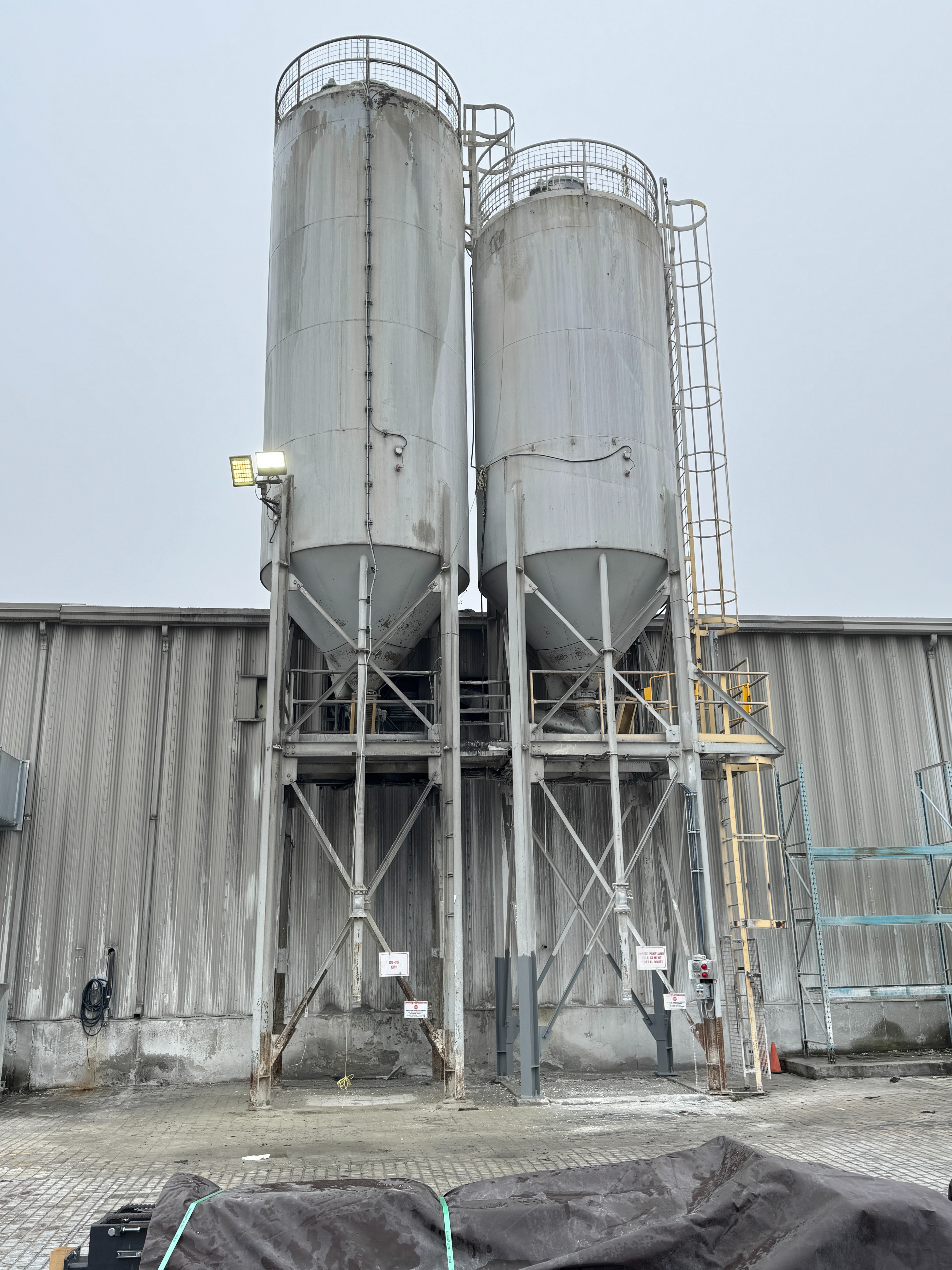 Includes ladders, guardrails, cement augers, cement loading pipes and a dust collector on top of each silo