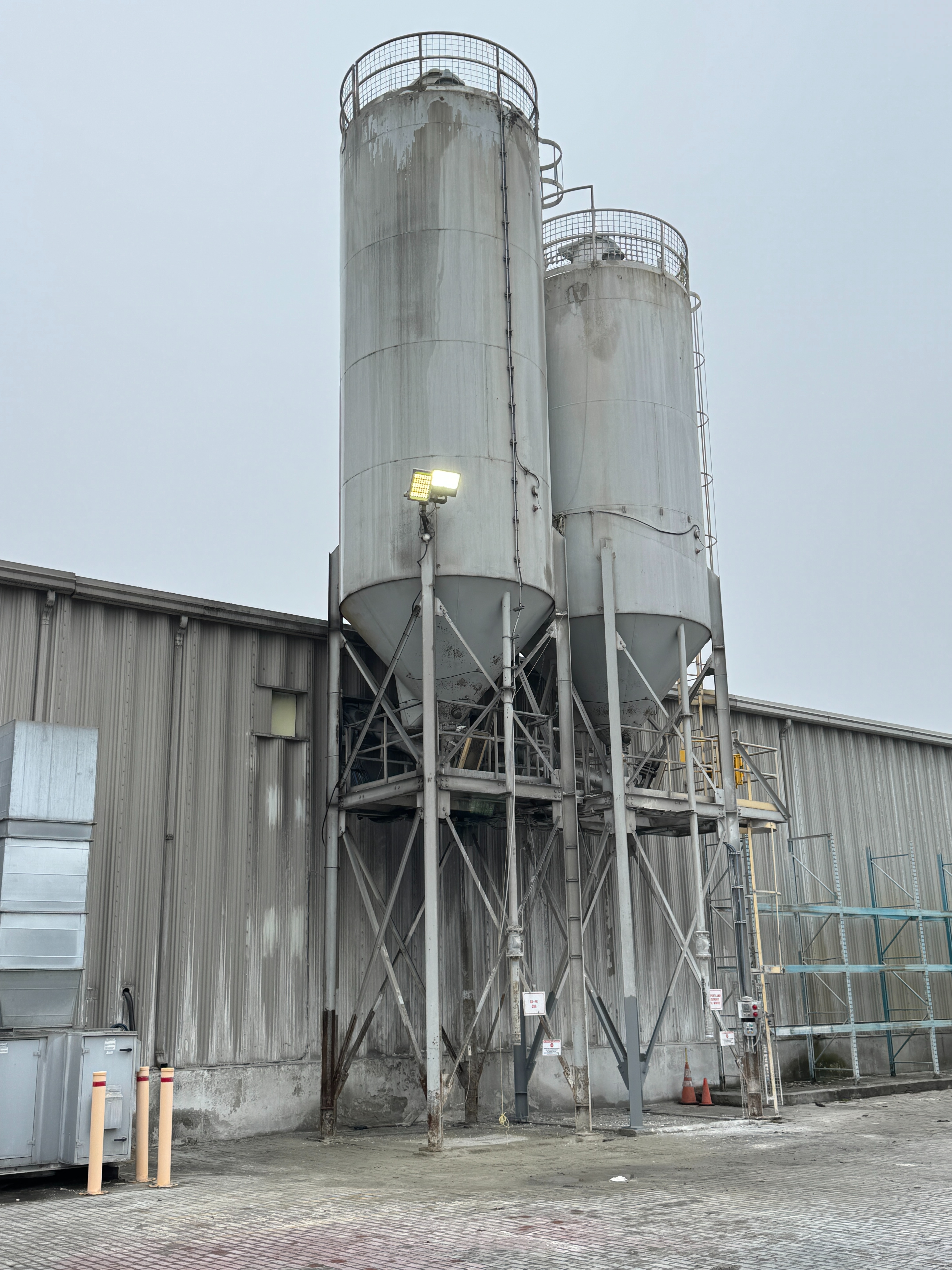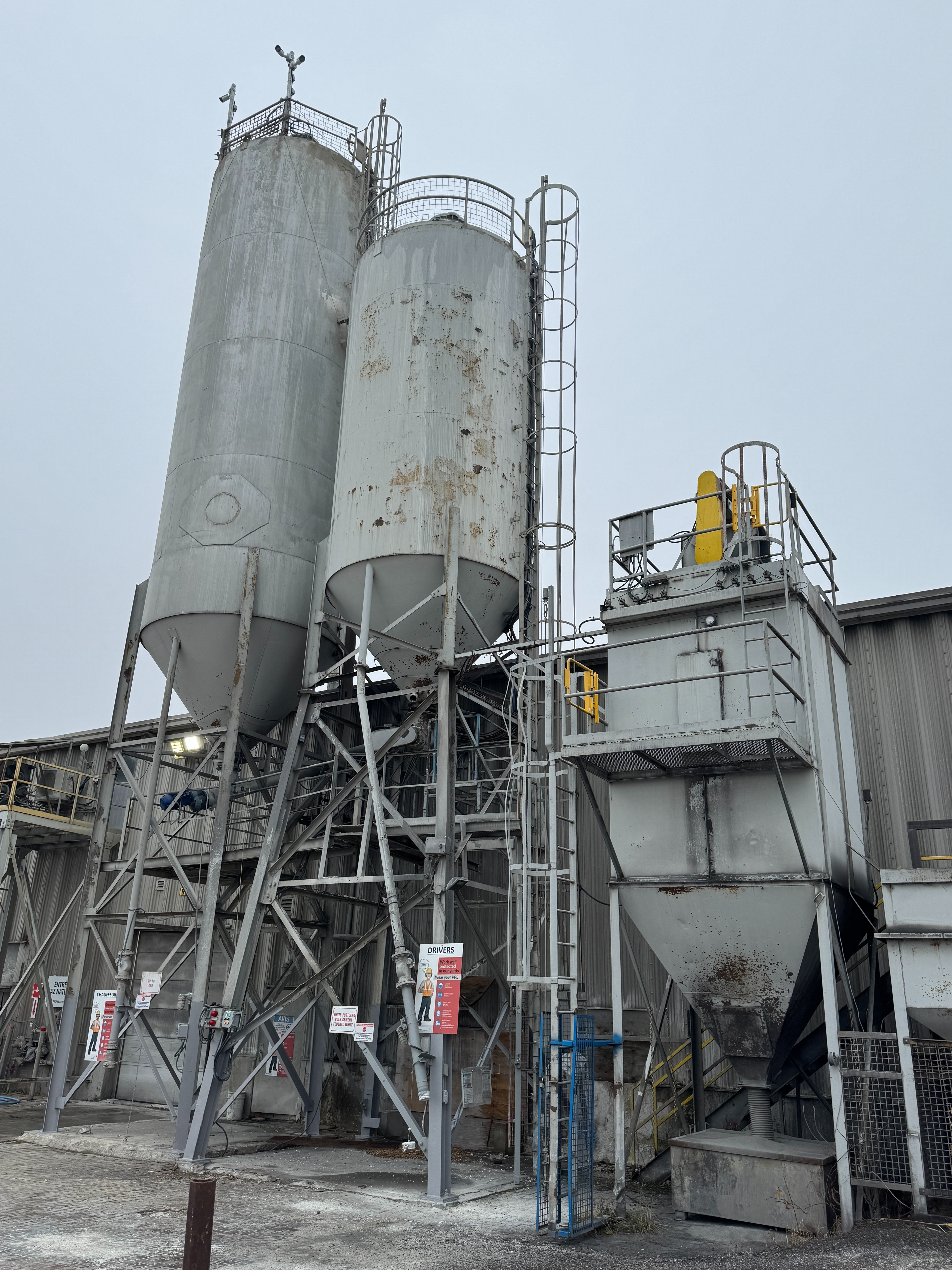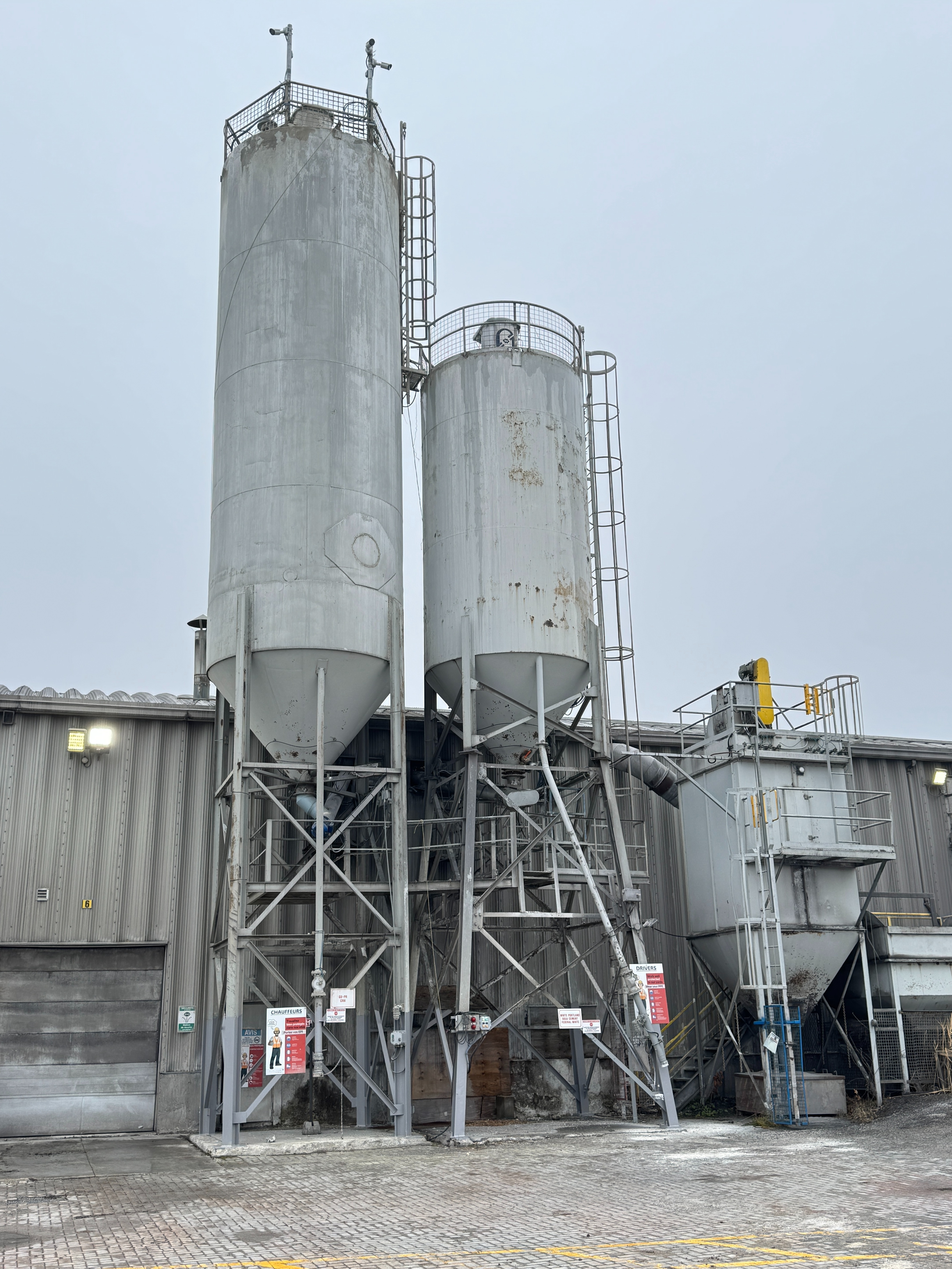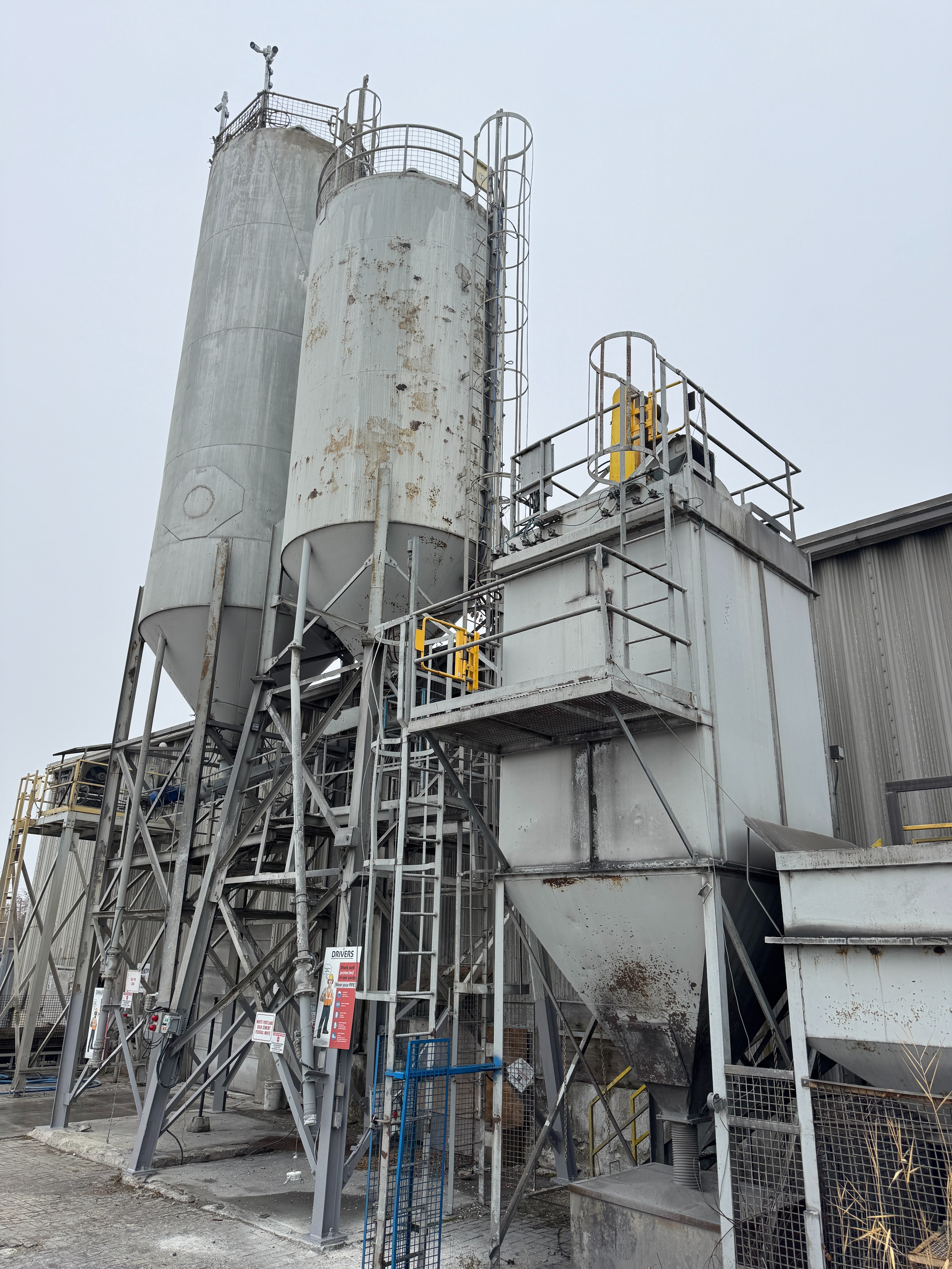 Includes ladders, guardrails, cement augers, cement loading pipes and a dust collector on top of each silo
