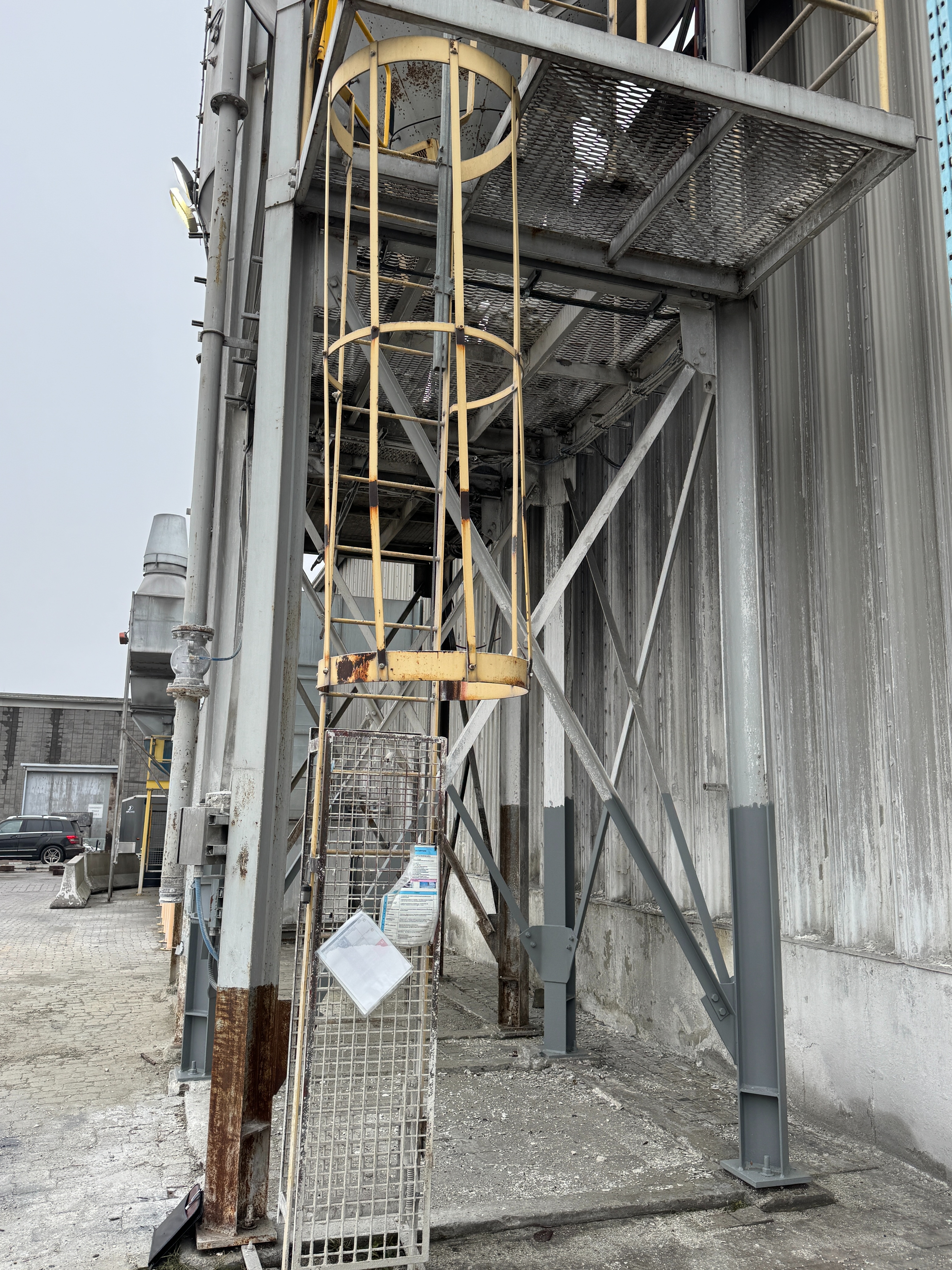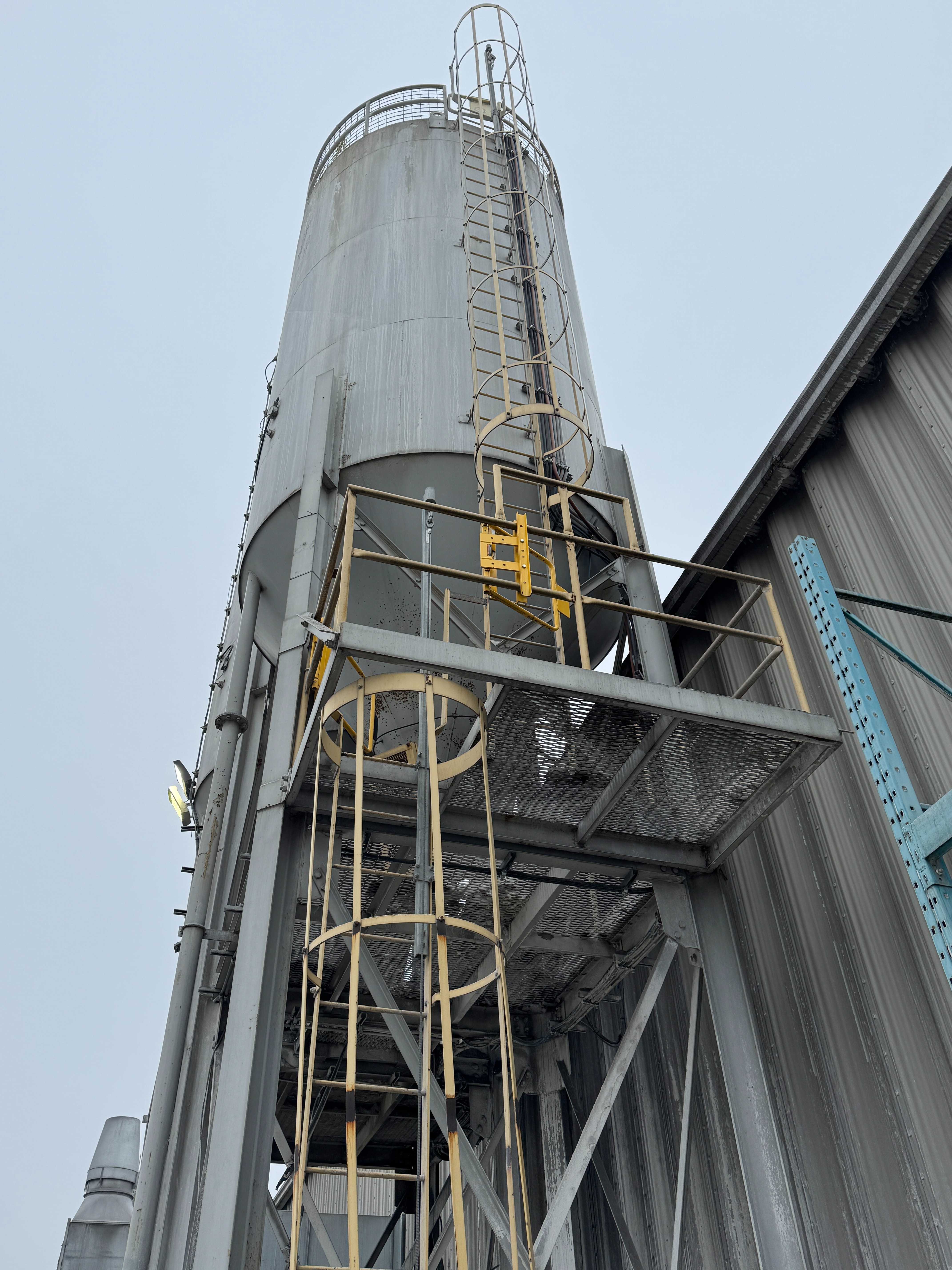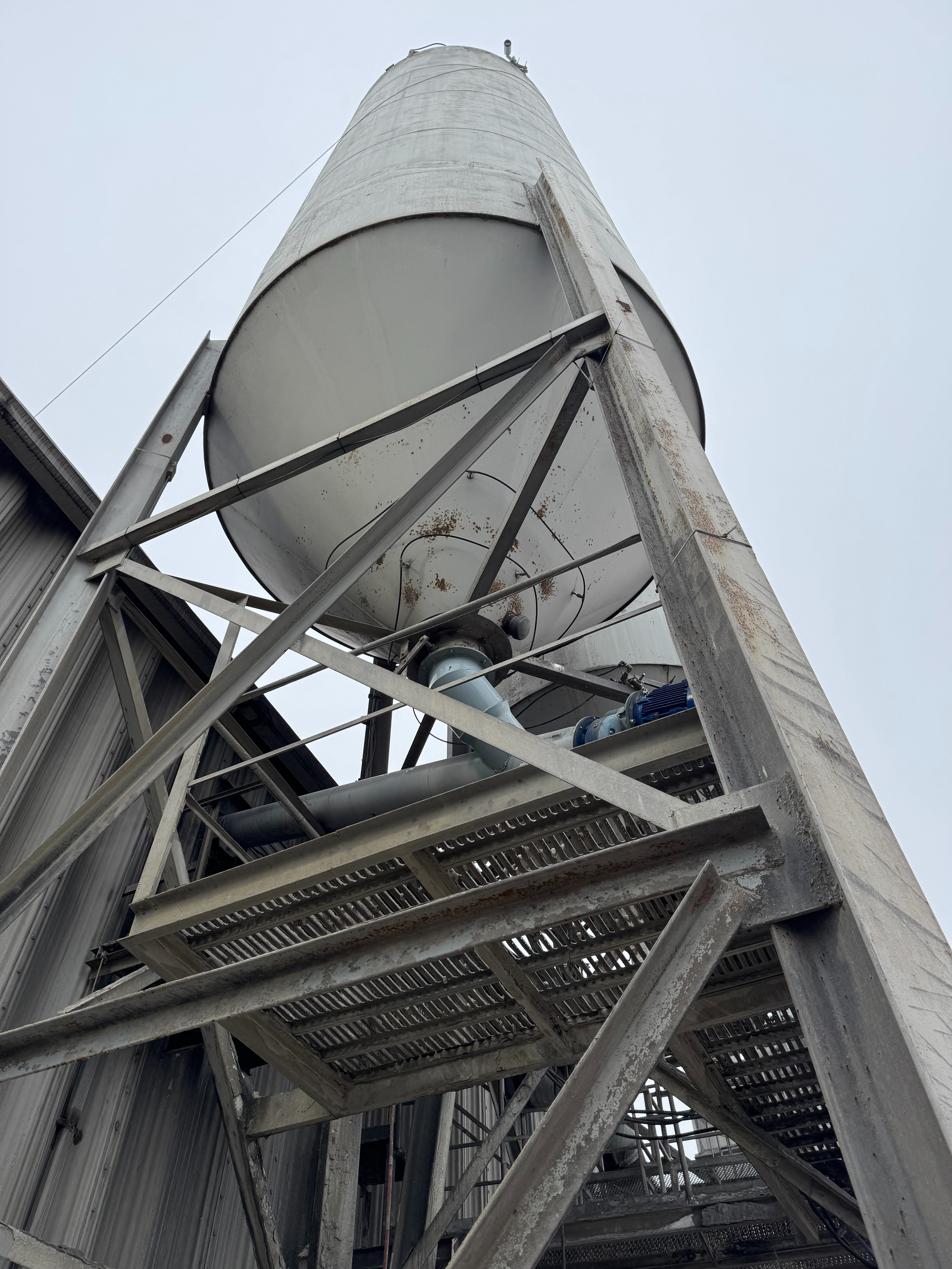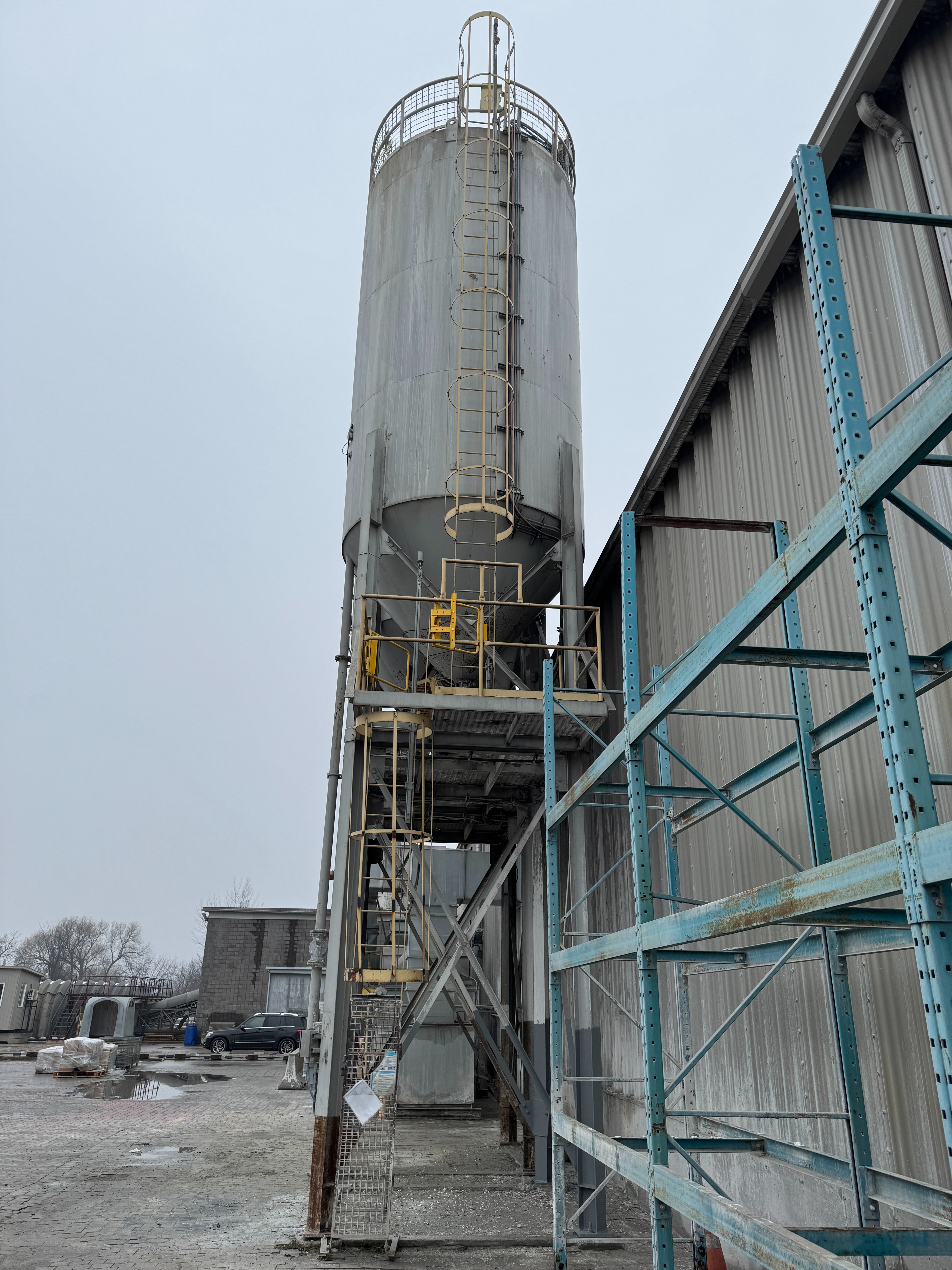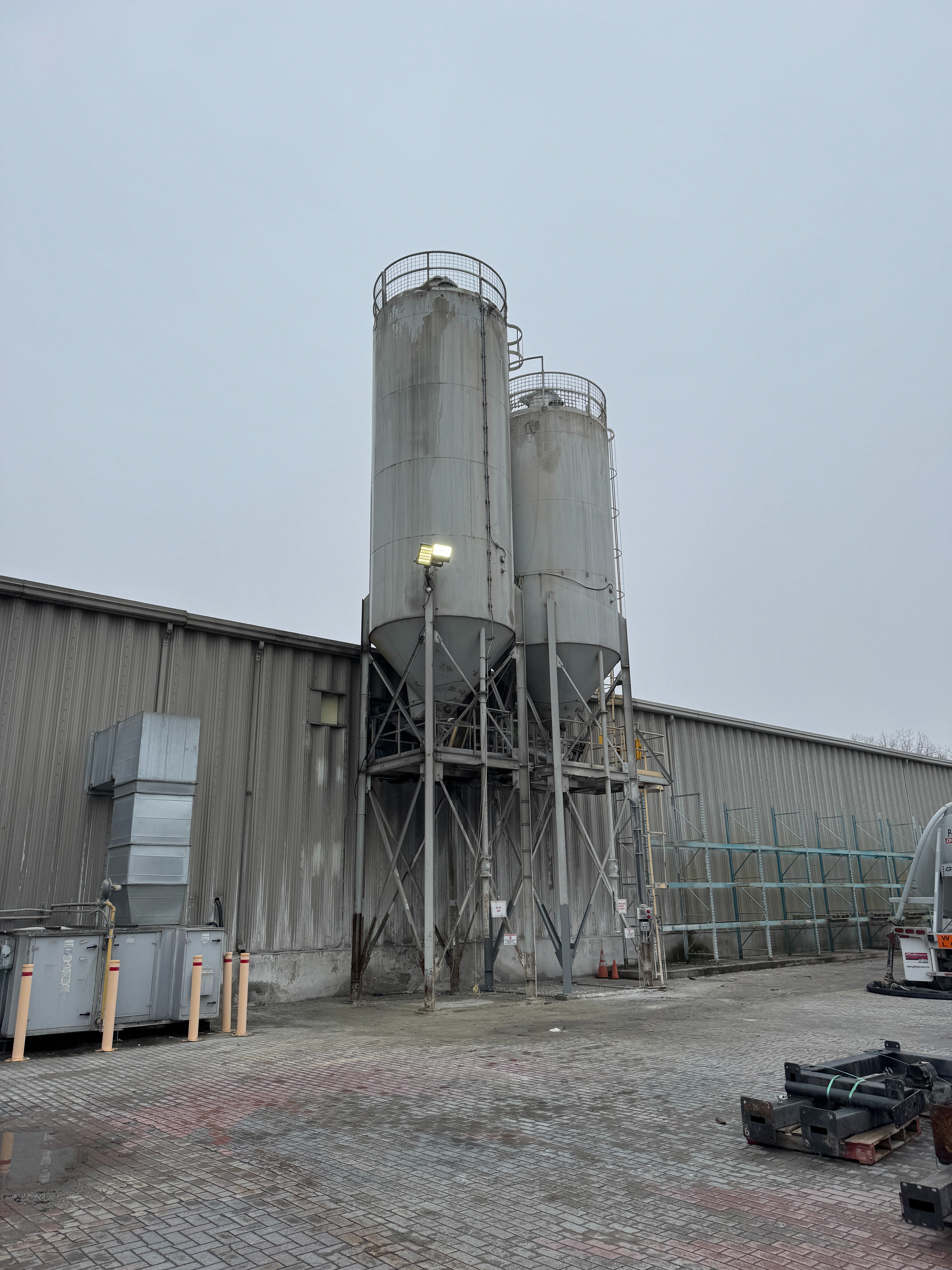 Includes ladders, guardrails, cement augers, cement loading pipes and a dust collector on top of each silo